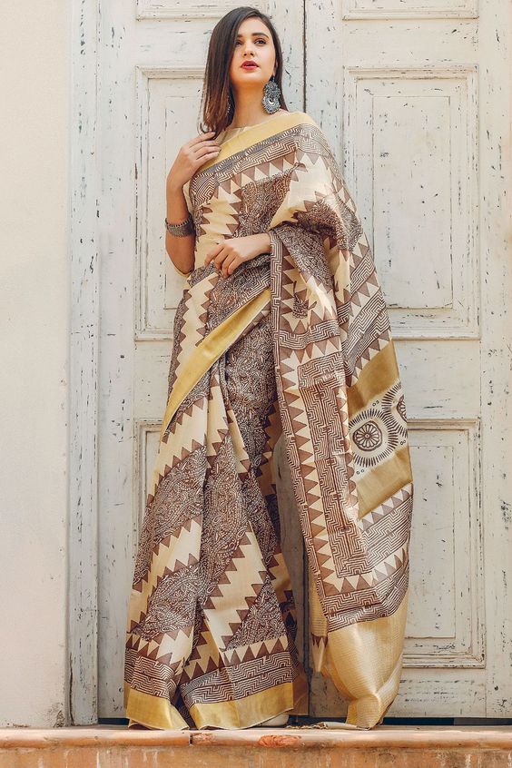 Catchy Cream Colour Linen Digital Printed Saree LS-119